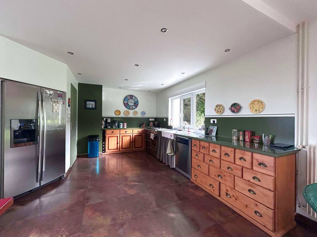 Le grand plus de la pièce à vivre et de sa cuisine, une belle luminosité grace à ses baies vitrées avec une vue sur le jardin.