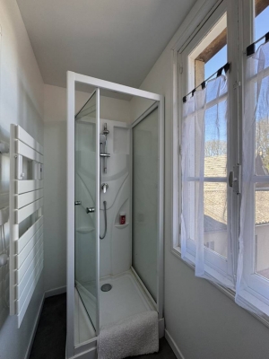 À l’étage, un palier distribue trois chambres, une salle de douche et un WC.