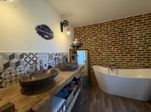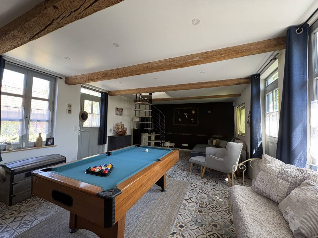 La maison principale : Elle offre de beaux volumes avec une pièce de vie d’environ 42 m2, comprenant une salle à manger et une cuisine avec cuisinière à bois, ainsi qu’un salon de 34 m2 agrémenté d’un poêle à bois, avec espace détente et coin billard.