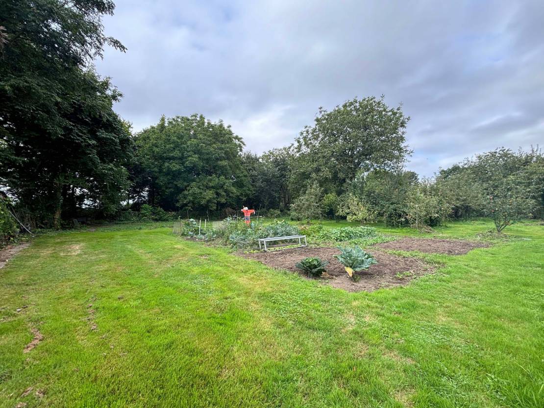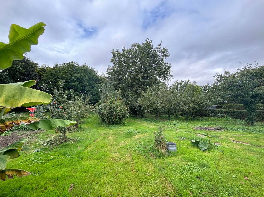 Sur les extérieurs d'une superficie totale de 3 387 m2, vous trouverez une partie boisée, un verger, plusieurs dépendances, un poulailler et un garage. Le terrain dispose de 2 entrées, une devant et une derrière la maison.