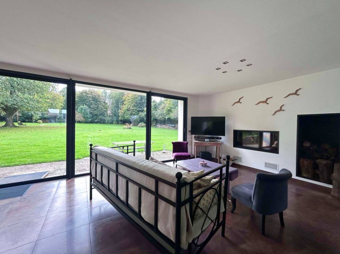 Le grand plus de la pièce à vivre et de sa cuisine, une belle luminosité grace à ses baies vitrées avec une vue sur le jardin.