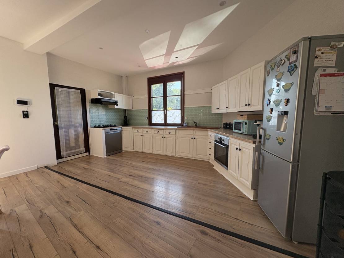 Elle offre une belle pièce de vie lumineuse et ouverte, comprenant un coin salon, une salle à manger et une cuisine aménagée.