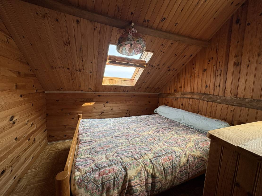 À l’étage, un premier palier dessert une chambre ainsi qu’un grenier, tandis qu’un second palier mène à un bureau (ou petite chambre) et à une troisième chambre.