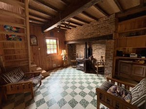 À l’intérieur, un séjour lumineux avec un espace salon chaleureux, équipé d’un insert à bois vous accueille, suivi d’une salle à manger pouvant également être aménagée en chambre.