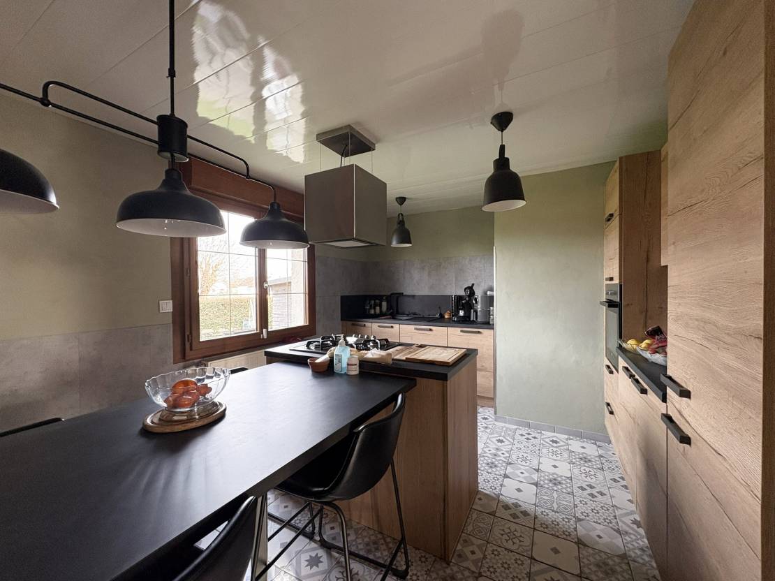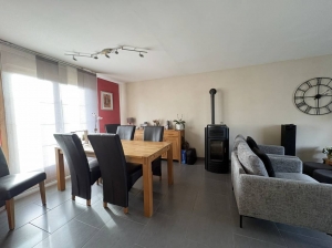 Cette maison se compose d’une entrée donnant sur un vaste séjour lumineux et chaleureux, équipé d’un poêle à granulés.