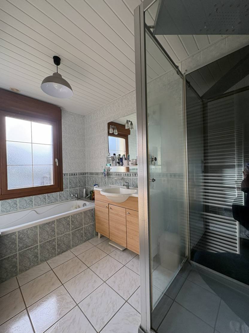 Au rez-de-chaussée, vous trouverez également une cuisine entièrement équipée, une salle de bain avec douche et baignoire, un WC ainsi que deux chambres.