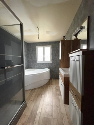 De plain-pied, elle offre également trois chambres, un WC, une salle de bain avec douche et baignoire, une belle pièce de vie faisant office de salon et salle à manger, ainsi qu’une buanderie.