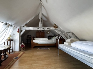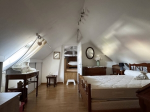 À l’étage, un palier avec rangements et placards dessert deux chambres en enfilade.