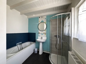 À l’étage, un palier distribue trois chambres, une salle de douche et un WC.